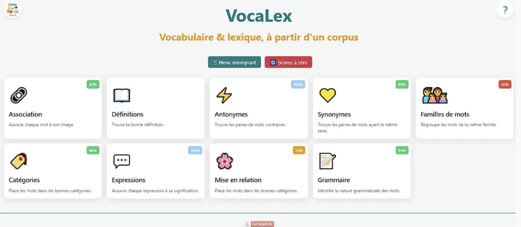 Vocalex génère automatiquement 9 activités interactives à partir d’une simple liste de mots que vous entrez dans l’application. Tout se fait en local (mais les concepteurs ont prévu une manière d’exporter les listes créées) et le suivi des réussites par élève est possible. Le petit plus (indéniable) est la connexion avec la base Arasaac qui permet de trouver l’image du mot entré. Une synthèse vocale est aussi disponible.