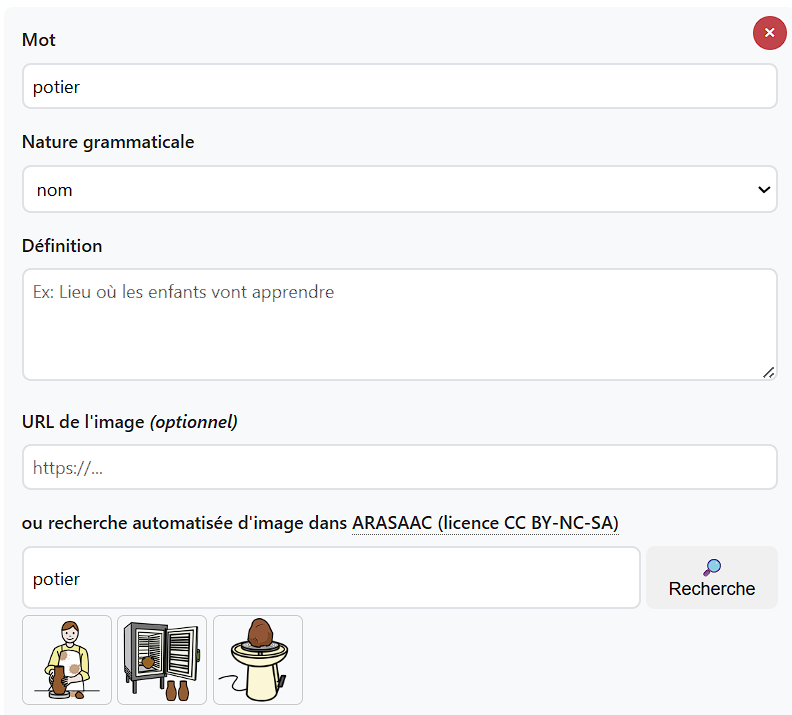 Tlab intègre un moteur de recherche des pictogrammes ARASAAC et ofrre le choix de la langue de recherche, ce qui peut permettre d’augmenter le nombre de résultats.