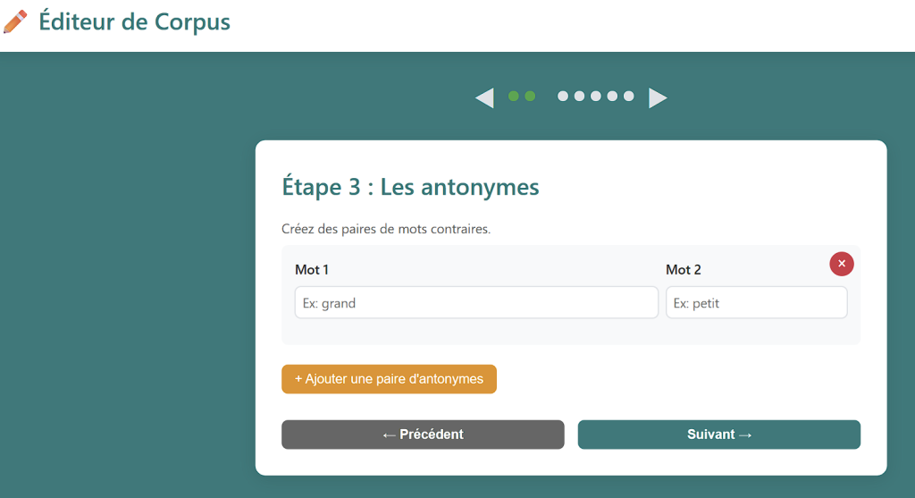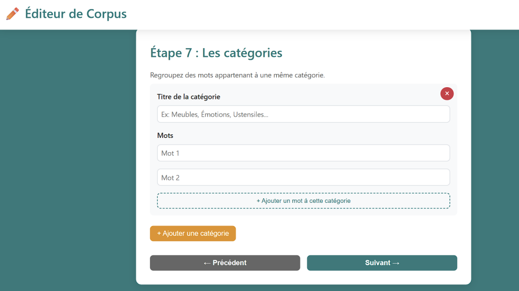 L’enseignant entre les mots voulus à travers un éditeur simple d’emploi. Il renseigne les activités qu’il souhaite et l’ouvre aux élèves. Il peut aussi récupérer un corpus déjà fait ce qui ouvre de nombreuses perspectives de partage… Les fichiers créés sont en Markdown, ce qui permet de les sauvegarder en ligne sur la plateforme Apps.Education.fr à travers le service CodiMd : https://portail.apps.education.fr/services/pad-avance-codimd.