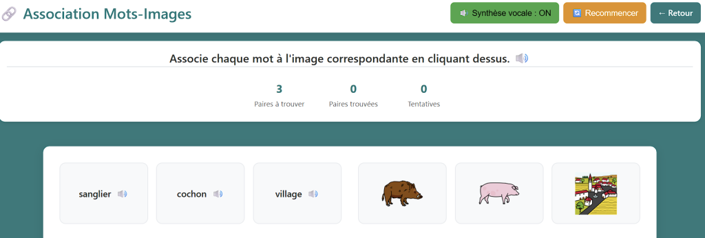 AinsiRapidÉtik est un outil permettant de créer rapidement un exercice de type « phrase en désordre ». Il suffit de saisir une phrase et de cliquer sur « créer l’exercice ». Les mots et la phrase peuvent être prononcés par la synthèse vocale.